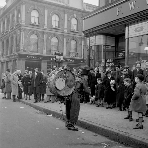 A one-man band performs to the crowds outside Woolworth's, Camden (cellulose acetate negative)