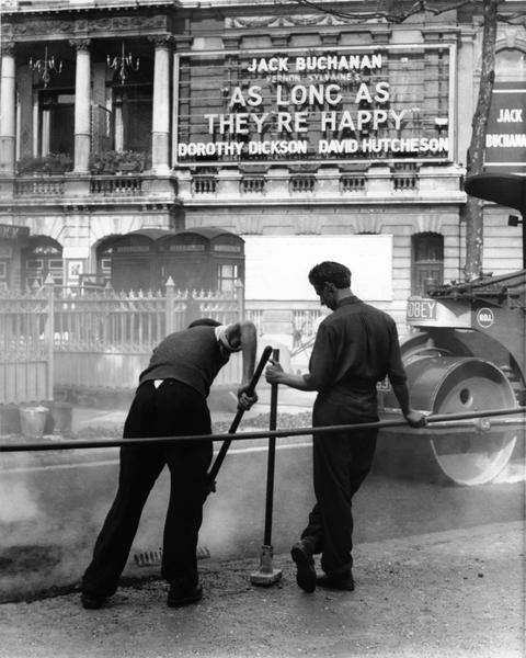 Road workers outside the Garrick Theatre on Charing Cross Road (silver gelatin print)