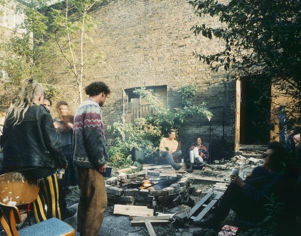 A group of friends by a make-shift fire outside a house on Ellingfort Road, Hackney (cibachrome print)