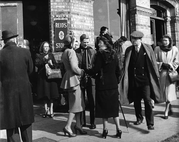 People gathered outside a pub in Hammersmith on boat race day (silver gelatin print)