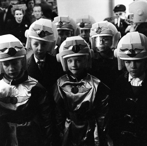 Young visitors to the Schoolboys Own Exhibition held at Olympia in fancy dress costume and helmets (negative)