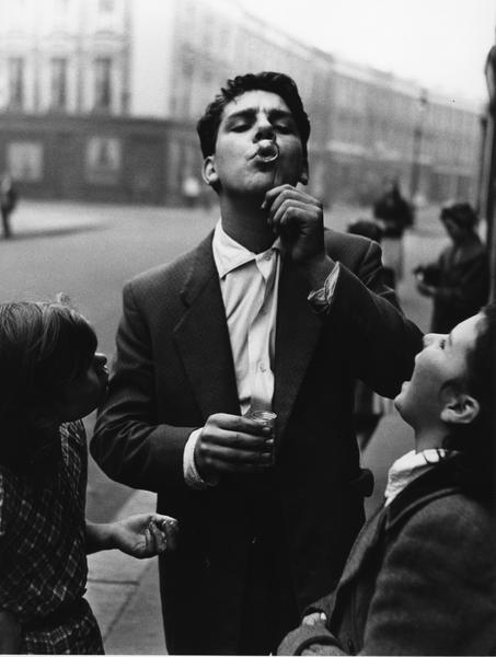 A youth blowing soap bubbles on Southam Street, W10 (silver gelatin print)