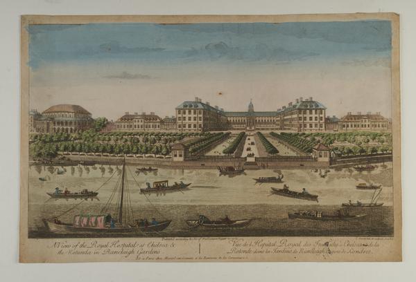 A view of the Royal Hospital at Chelsea and the Rotunda in Ranelagh Gardens (coloured engraving)