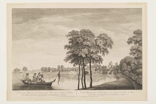 A View of the Palace from the South side of the Lake with the Temples of Bellona and Aeolus, & the House of Confucius in the Royal Gardens at Kew (engraving)