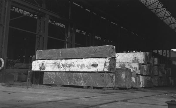 West India Docks: Piles of hardwood logs in 15B Shed on the Wood Wharves on 17th February, 1935. (cellulose acetate)