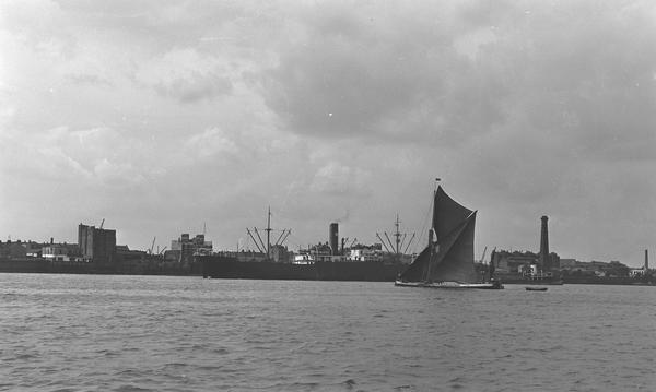 West India Docks: A heavily laden Thames barge passes a Norwegian Steamer lying off Concordia Wharf on 4th June, 1931. (cellulose acetate)