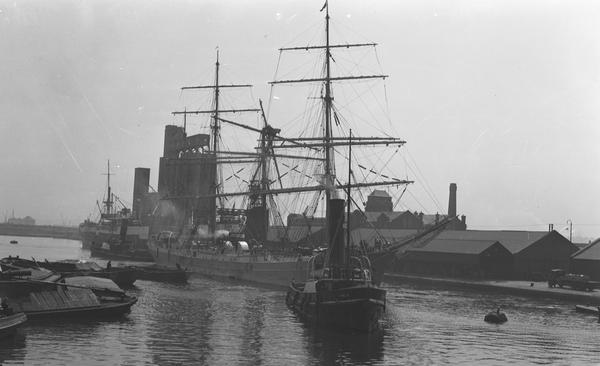 Millwall Dock: The damaged barque 'Abraham Rydberg' is manouvered into the quay in the Millwall Dock on 14th May, 1936. (cellulose acetate)