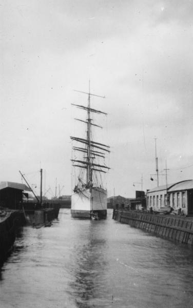 Millwall Dock: Men stowing sail on the main course yard on the barque 'Elfrieda' in March, 1928. (cellulose acetate)