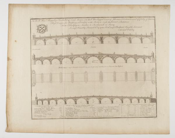 Designs for Building a Bridge with Stone to Cross the River Thames from Blackfriars, London, to Southwark in Surry (engraving)