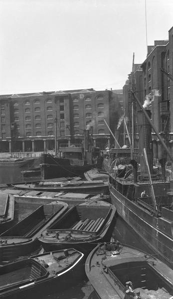 St. Katharine Dock: Lighters and coasters in the eastern basin, in June, 1930. (cellulose acetate)