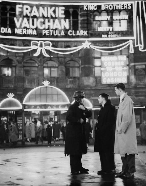 A group of men talking outside the Palace Theatre, Shaftsbury Avenue (silver gelatin print)