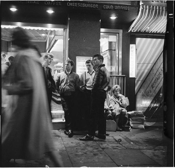 A group of 'teddy boys' stand outside a burger bar, West End (gelatin silver print)