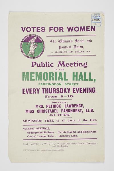 Public Meeting. Memorial Hall, Farringdon Street. Women's Social and Political Union (notice)