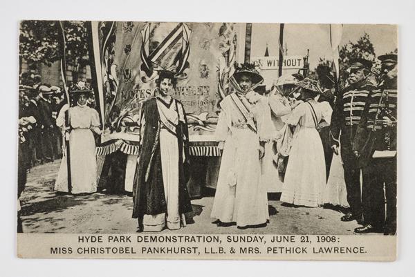 Hyde Park Demonstration, Sunday, June, 1908: Miss Christobel Pankhurst, LL.B. & Mrs. Pethick Lawrence. (photographic postcard)