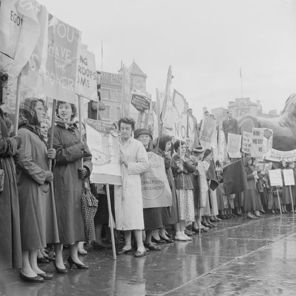 In August 1945, the US dropped two atomic bombs on Japanese cities, killing over 100,000 people and effectively ending the Second World War (1939–1945). By 1953, Britain had completed its own nuclear test. But there was concern over the terrifying power and toxic radioactivity of the new weapons. This protest at Trafalgar Square in 1957 was staged by a precursor to CND.