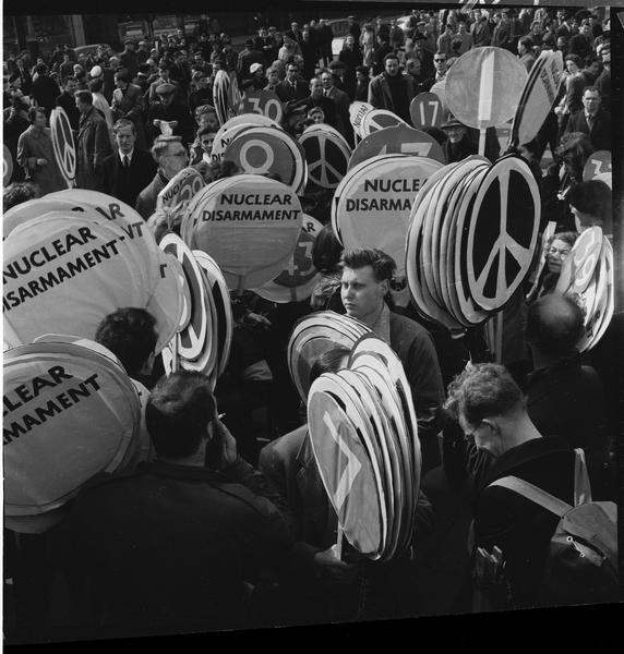 In the UK, major protests calling for a ban on nuclear weapons began in the late 1950s, led by the Campaign for Nuclear Disarmament (CND). The anti-nuclear, pro-peace campaign group became a feature of the city’s culture and politics, particularly in the 1960s and again in the 1980s.