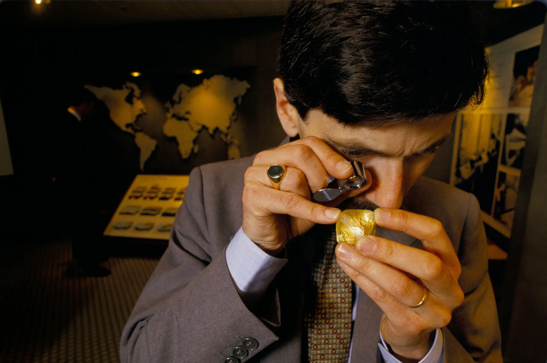 Diamond expert examines a marquise diamond in his Hatton Garden office.