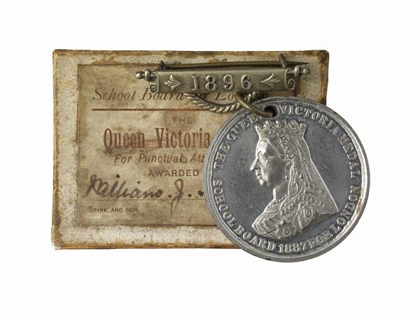 The London school board gave out medals like this to encourage children to go to school, at a time when many were still needed by their families for work. One one side, it reads: "Awarded to W.J. Seaman for punctual attendance every time the school was opened during the school year ended 1896".