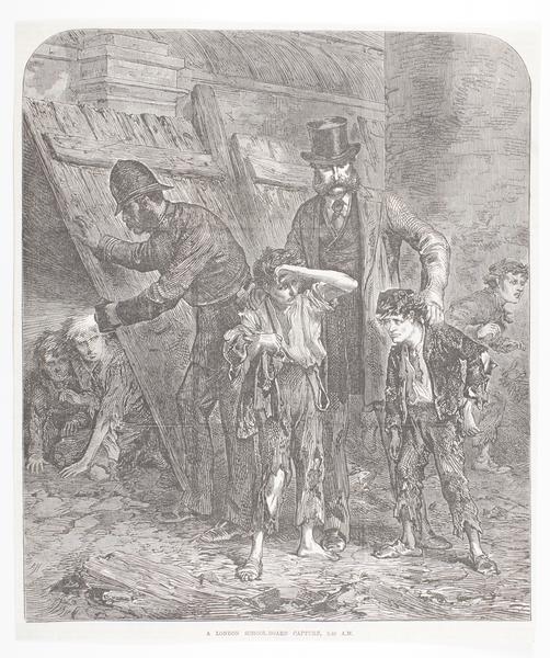 The government acted on education in 1870, introducing school boards to manage schools and create them where they were needed. In 1880, schooling was made compulsory for children aged 5–10. But getting children to lessons was harder than changing the law. This illustration shows children being rounded up by the school board in Charing Cross.