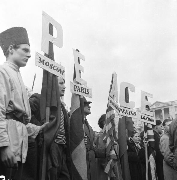On May Day in 1951, demonstrators held a 'peace rally' in London in reaction to the tensions of the Cold War. These protesters wore international dress and carried flags mounted with letters which spell out the word ‘peace’.