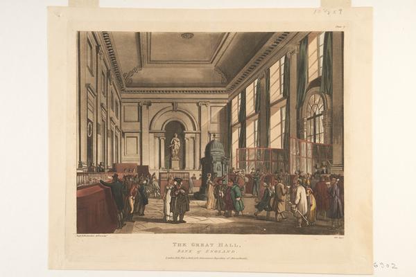 This shows the bank when it occupied a building on Threadneedle Street designed by John Soane during the late 18th and early 19th century. Bank notes were issued and exchanged in the Great Hall. Most of Soane’s buildings were demolished in the 1920s to make way for a bigger modern replacement that fit the bank’s modern needs.