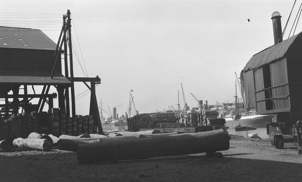 Tatton Mather paints lightermen at work and a timber raft floating in Surrey Commercial Docks, 1881.