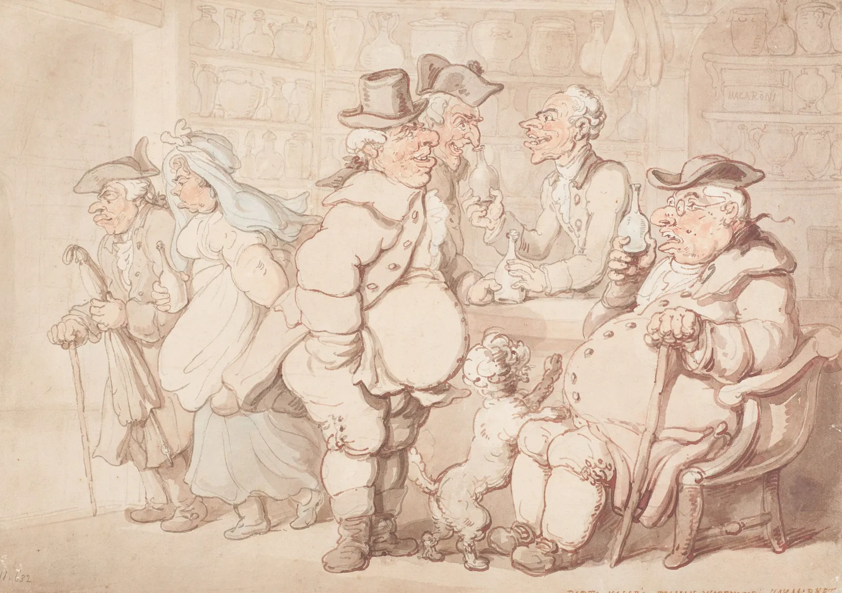 In one of his classic caricatures, Rowlandson shows customers sampling herbal remedies at an Italian warehouse in Haymarket, central London.