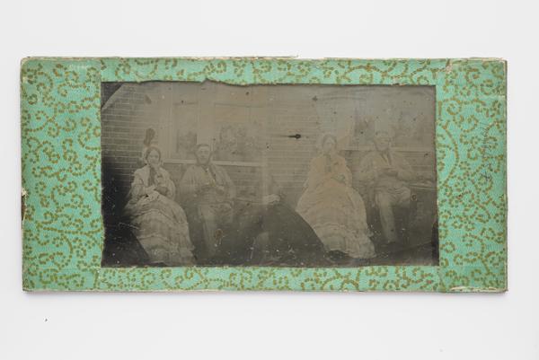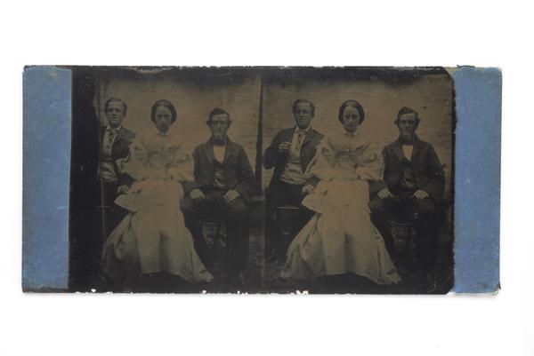 In the early decades of photography, several techniques evolved to capture and print images. Stratton’s photos are called ambrotypes, which are negative images that have been modified to be positives. A thin sheet of glass was coated in a material called collodion, dipped in silver nitrate and exposed to light. You’re looking at that glass plate, which has been bleached and backed with dark silk.