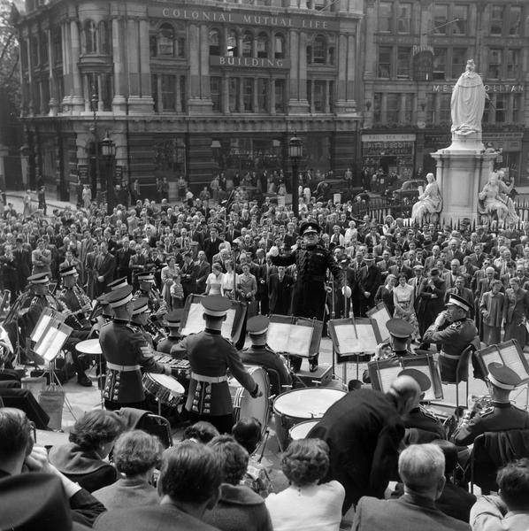 Coldstream guards band on the steps of St Paul's Cathedral (negative)