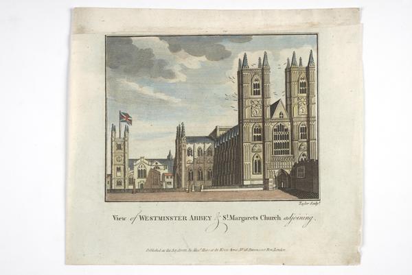 View of Westminster Abbey and St Margaret's Church adjoining (hand-coloured engraving)