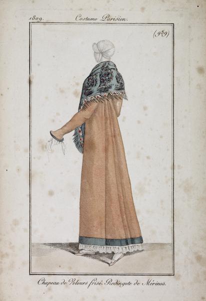 Chapeau de Velours frise. Redingote de Merinos (hand coloured engraving)