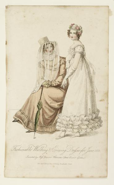 Fashionable Walking & Evening Dresses for June 1821 (coloured engraving)
