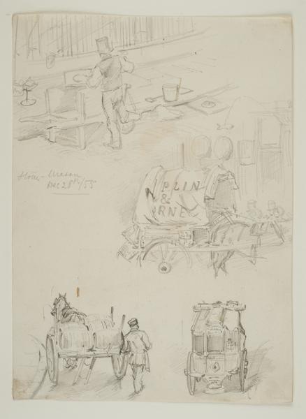 Sketches of a stone mason, a covered cart, a dray horse and an omnibus (pencil drawing)