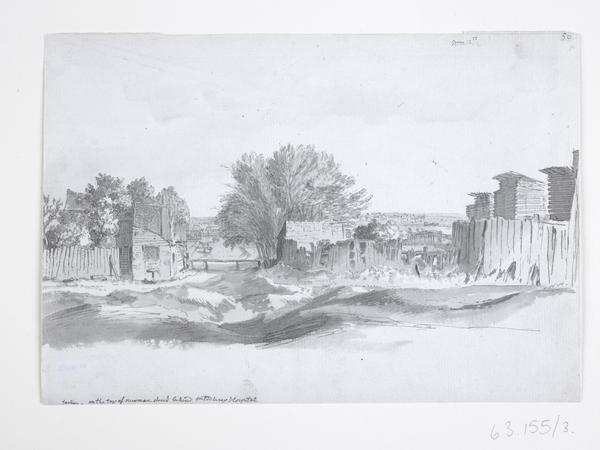 A farm with a timber yard, on the top of Newman Street (ink and wash drawing)