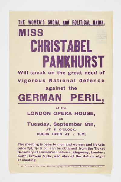 Miss Christabel Pankhurst on National Defence. London Opera House. Women's Social and Political Union. (notice)