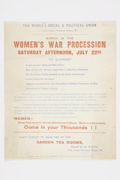 Women's War Procession, Victoria Embankment. Women's Social and Political Union. (notice)