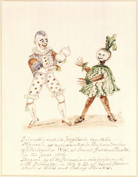 Grimaldi and his 'pugilistic vegetable figure' (watercolour and pencil drawing)