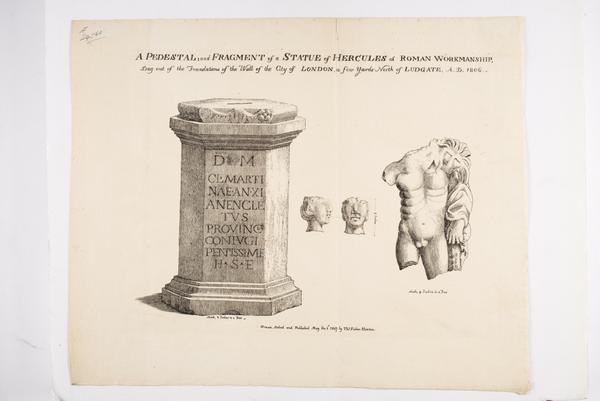 A Pedestal; and Fragment of a Statue of Hercules of Roman Workmanship, Dug out of the Foundations of the Wall of the City of London, a few yards North of Ludgate, A.D.1806. (etching)