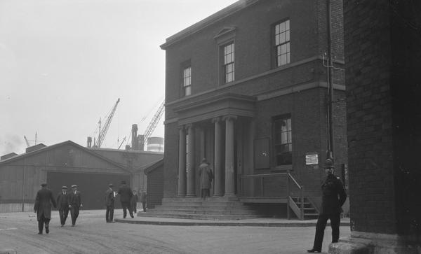 East India Dock. The 'Anchorage' offices viewed from the East of the main entrance archway. (cellulose acetate)