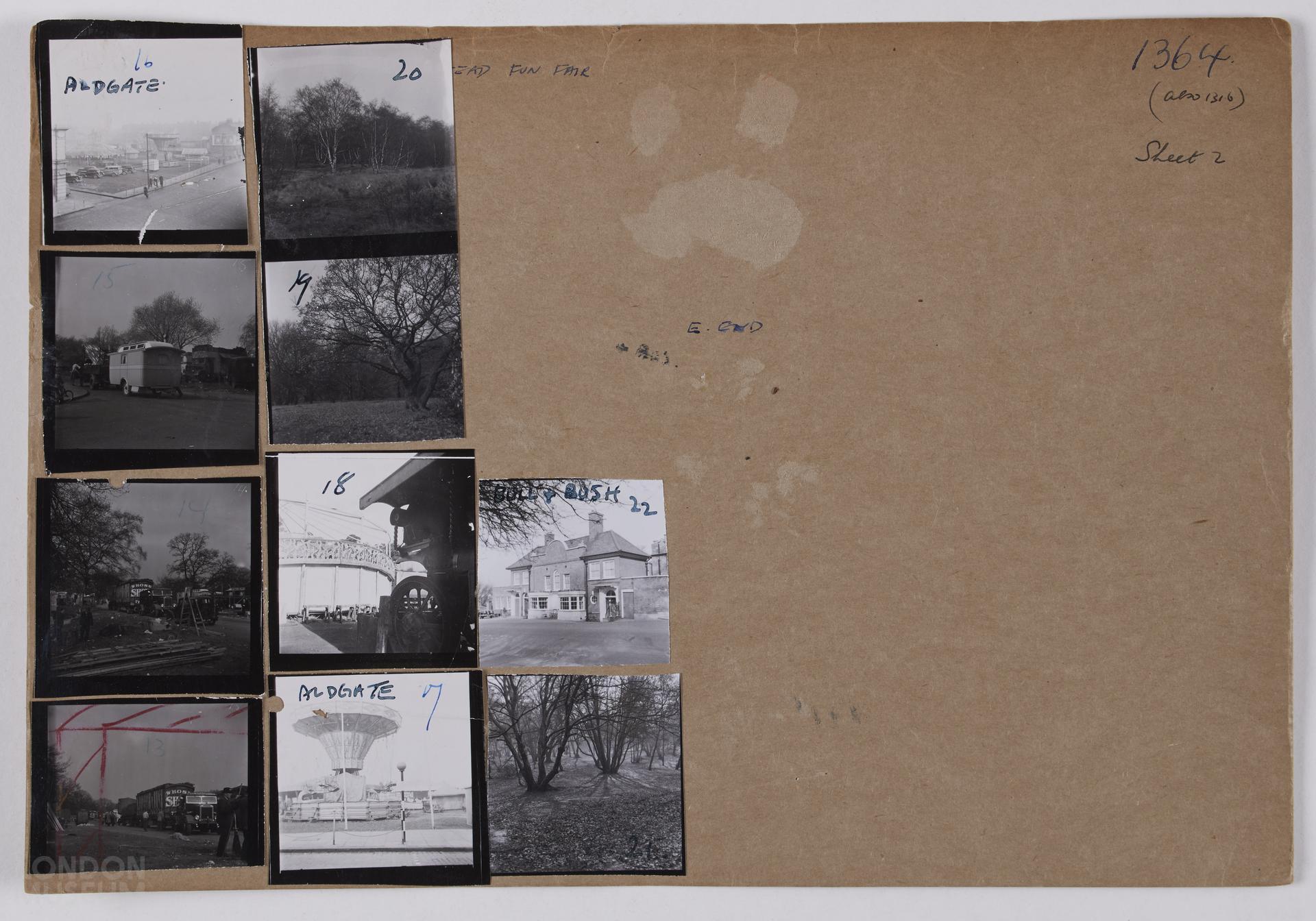 Hampstead Fun Fair, no date: various shots of setting out the funfair, The Bull and Bush public house. Crowds at the fair on various rides, dodgems merry-go-rounds. 6x6 cm (1-22) and 35 mm (51-83). 2 of 3 sheets.