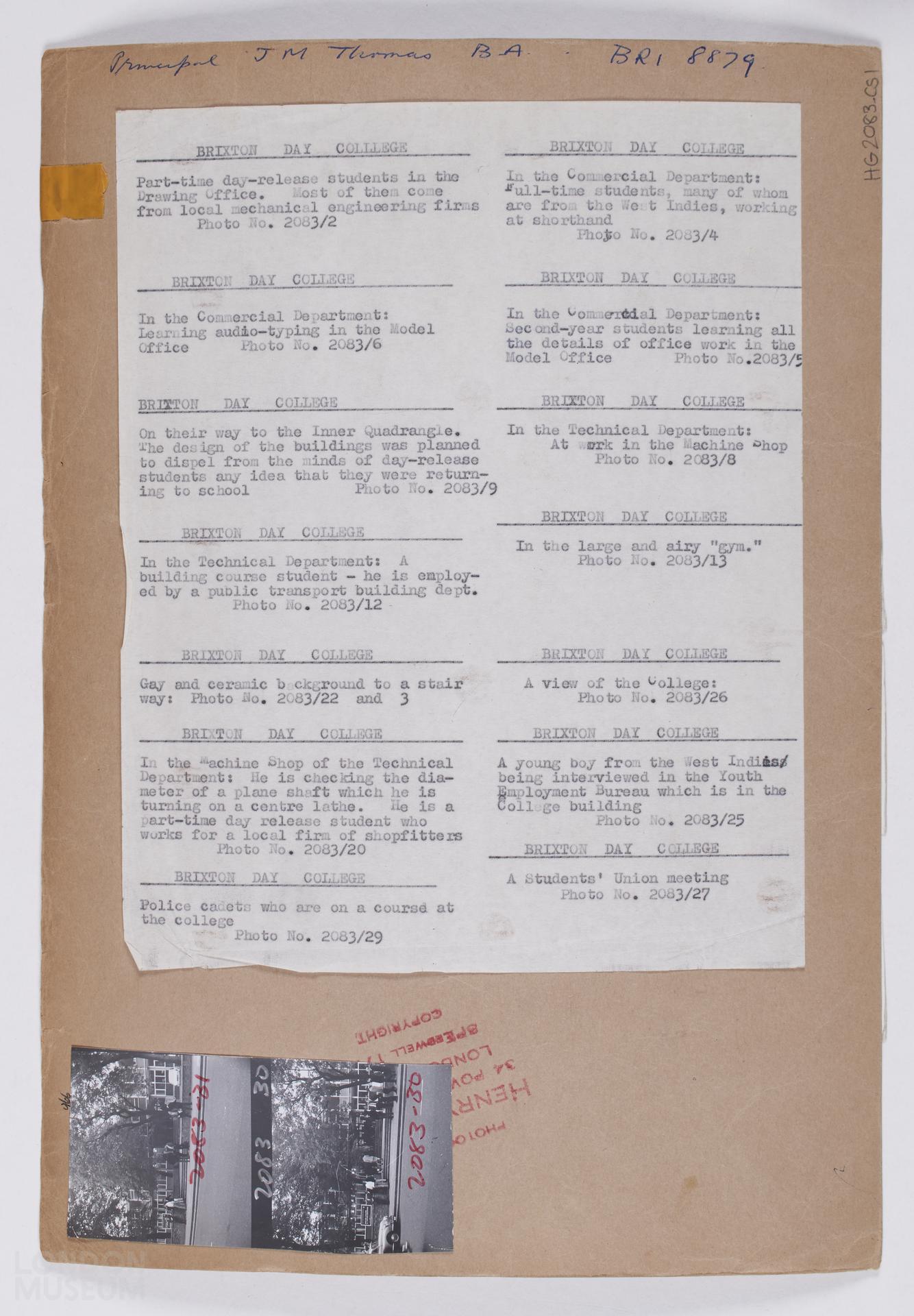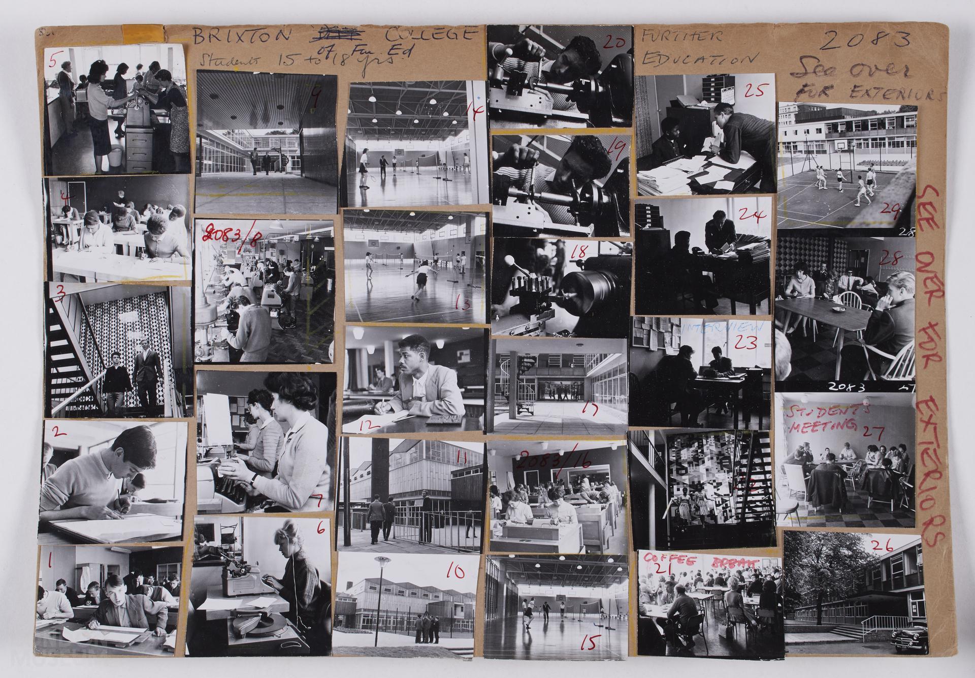 Contact sheet, depicting images of Brixton College of Further Education, no date. Photographs show interiors and exteriors of the college, students training, in canteen, and taking part in sports etc. Images numbered (1-31). Contacts 30 and 31 and typed notes relating to the content of the photographs, adhered to the reverse of the mount.