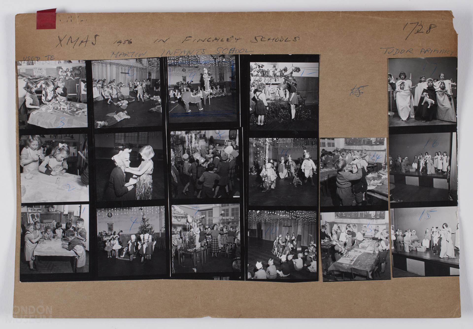 One contact sheet titled 'Christmas in Finchley Schools'. Images depict Martin Infant School and Tudor Primary School. Children are shown making decorations and performing. 6x6cm (images are numbered 1-17).