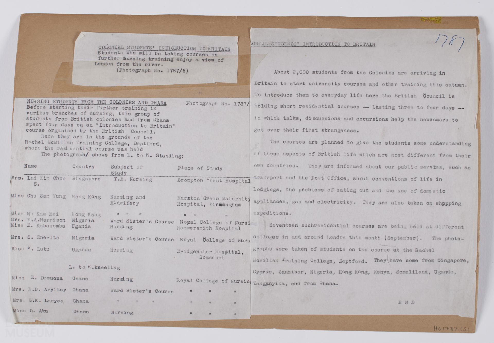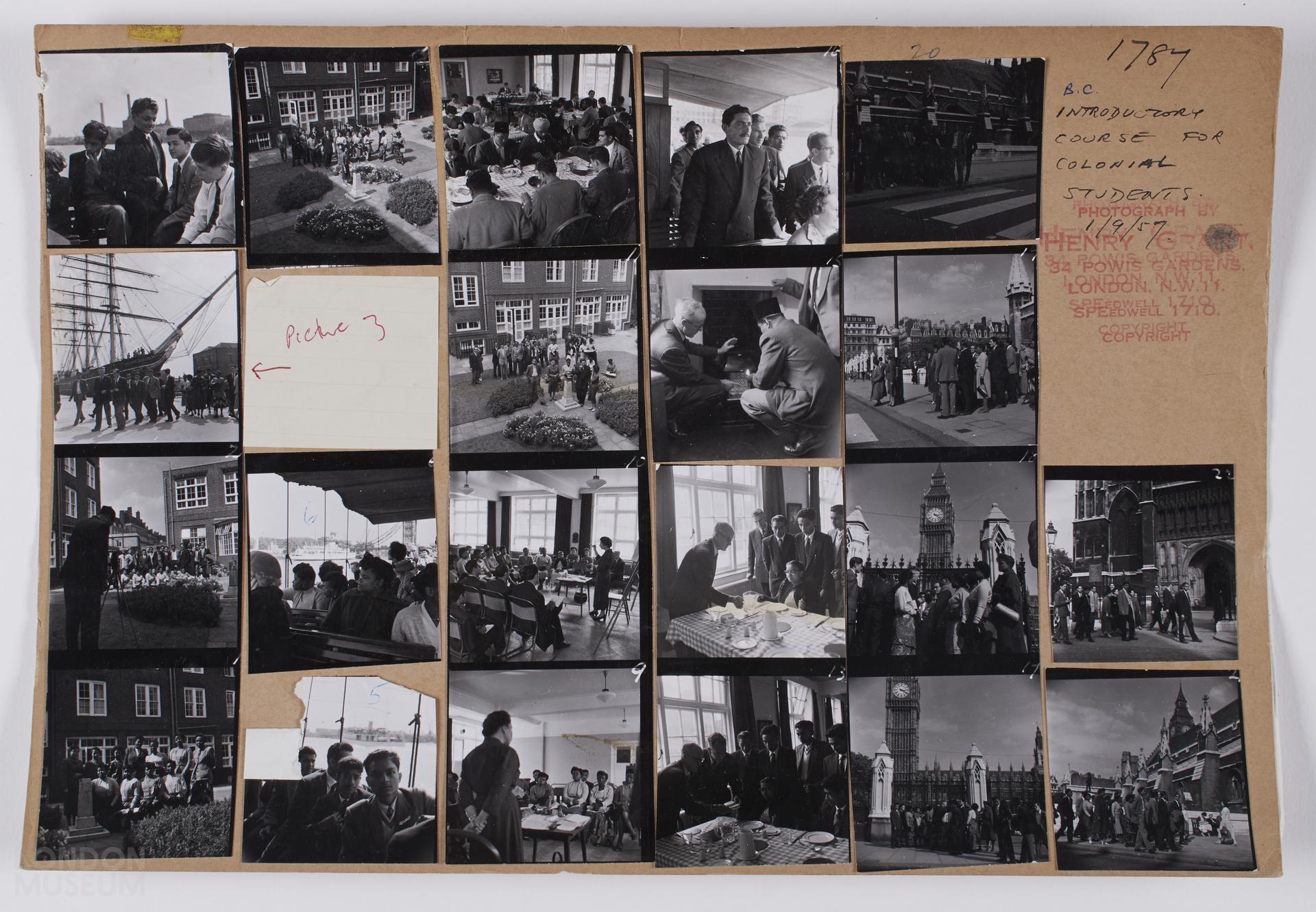 One contact sheet titled 'B.C. Introductory Course for Colonial Students', 1/9/1957. Images depict black and asian students in a classroom, visiting the Cutty Sark, eating in a canteen, and visiting Westminster. 6x6cm (images are numbered 5, 6, 9-13 ,15-19, 21, 22).