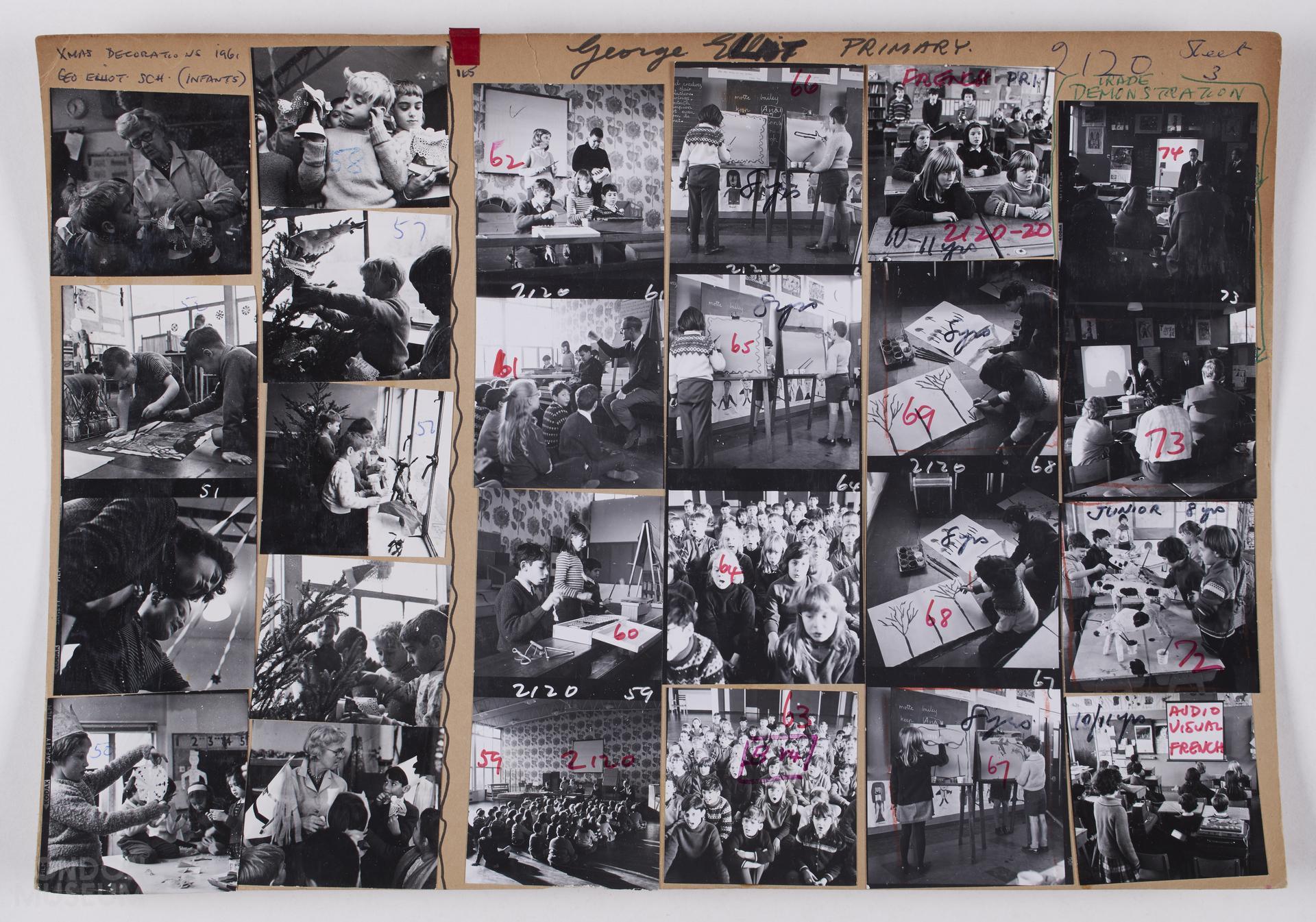 Contact sheet depicting images of George Eliot Primary School, 1961. Photographs show junior children in the "before school gym" class. Infants making Christmas decorations. Pupils in various lessons, in the playground and reading comics. Sheet 3 of 5 contact sheets. Photographs numbered 50-52, 56-69, 72-74). 4 photographs not numbered.