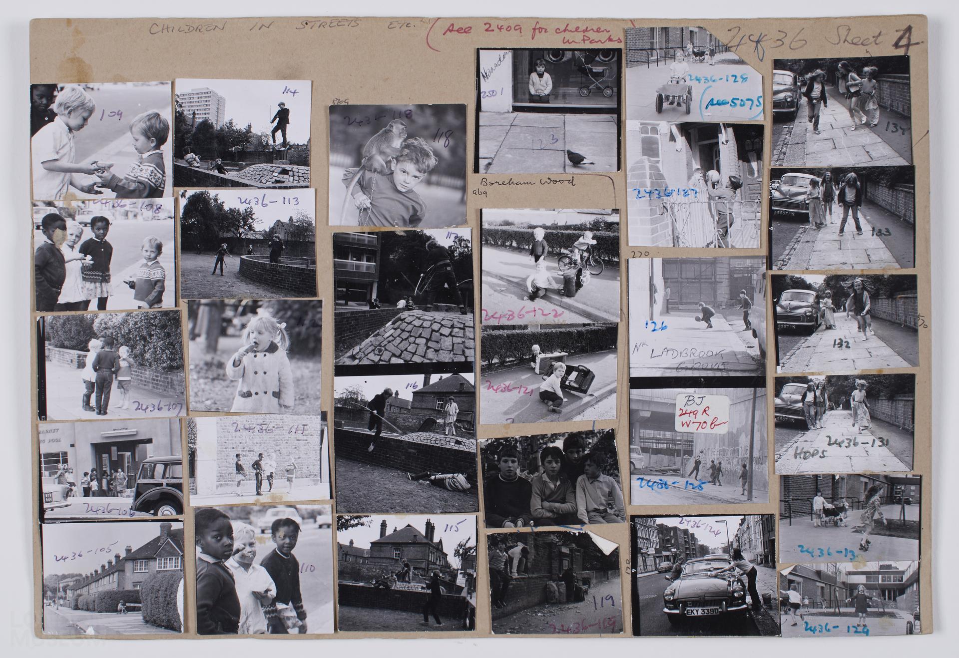 London Children in Streets, 1963, 1966-70. Images of children playing in streets, eating fish and chips, some shots at Kings Cross, at Highbury, Saturday Morning Cinema Show, at Copenhagen Street, N1, Whitestone Pond, ALBANY Estate, children smoking, recreation ground off Watfod Way, in Camden, at Regents Canal, Boreham Wood, Labrook Grove. Contacts numbered 105-134. Sheet 4 of 4.
