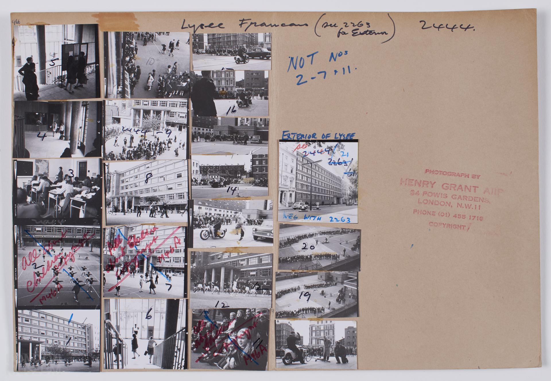 Lycee Francais, 1966. Images of interior and exterior views. Contacts numbered 1-21. 1 sheet.
