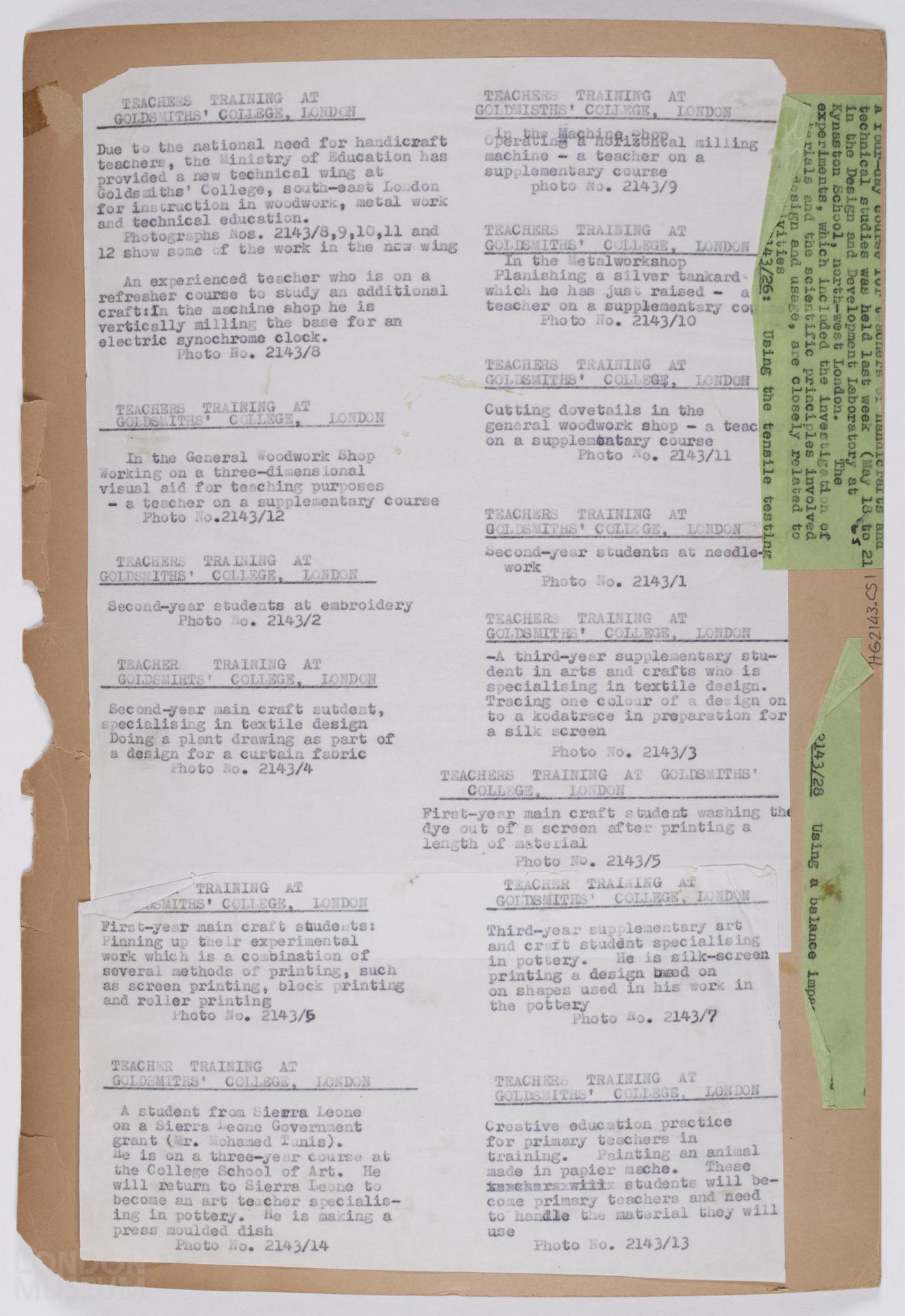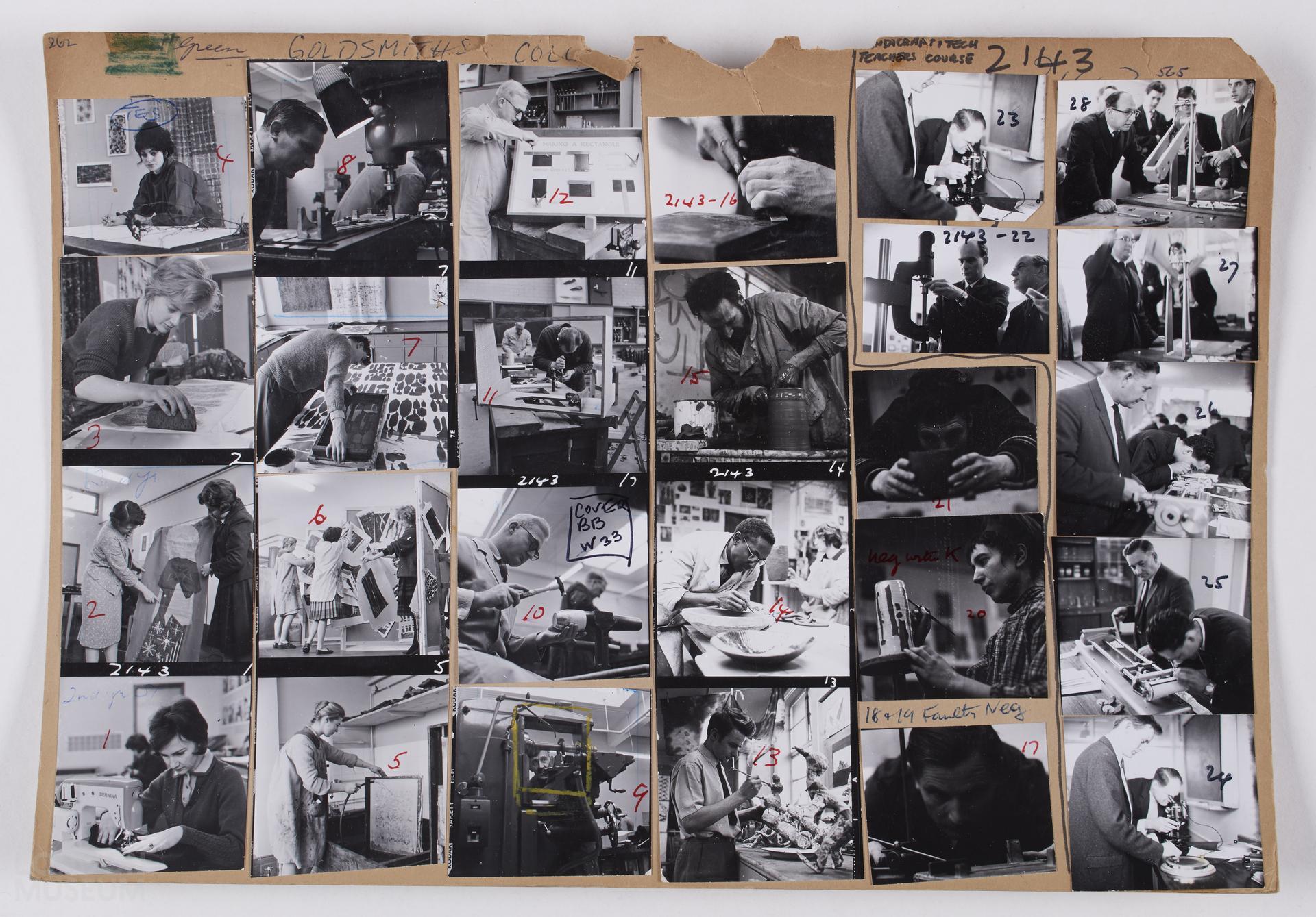 Contact sheet on paper with images related to Teacher Training. Photographs show training at Goldsmiths College, no date, teacher's course on Handicrafts and Technical Studies at Kynaston School, North West London, 18-21/05/1965. Photographs numbered 1-17, 20-28. Typed notes related to the content of the images, adhered to the reverse of the mount card.