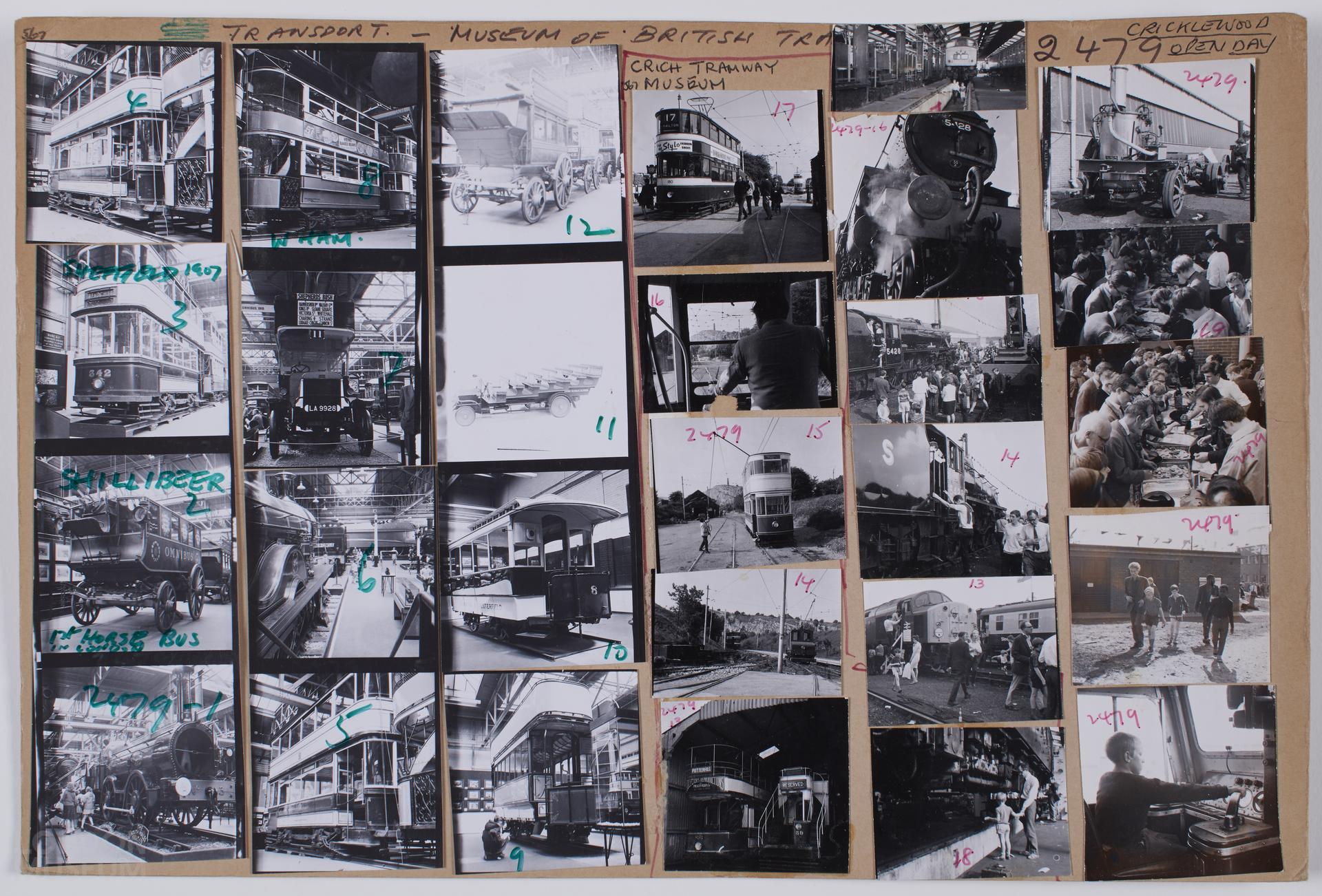 Transport, 1967, Museum of British Transport, Crich Tramway Museum, with views of trams and trains, open day at museum at Cricklewood. Contacts numbered 1-12, 13 x 2, 14 x 2, 15 x 2, 16 x 2, 17, 6 unumbered, 1 sheet, with notes on a sheet of paper adhered to the reverse.