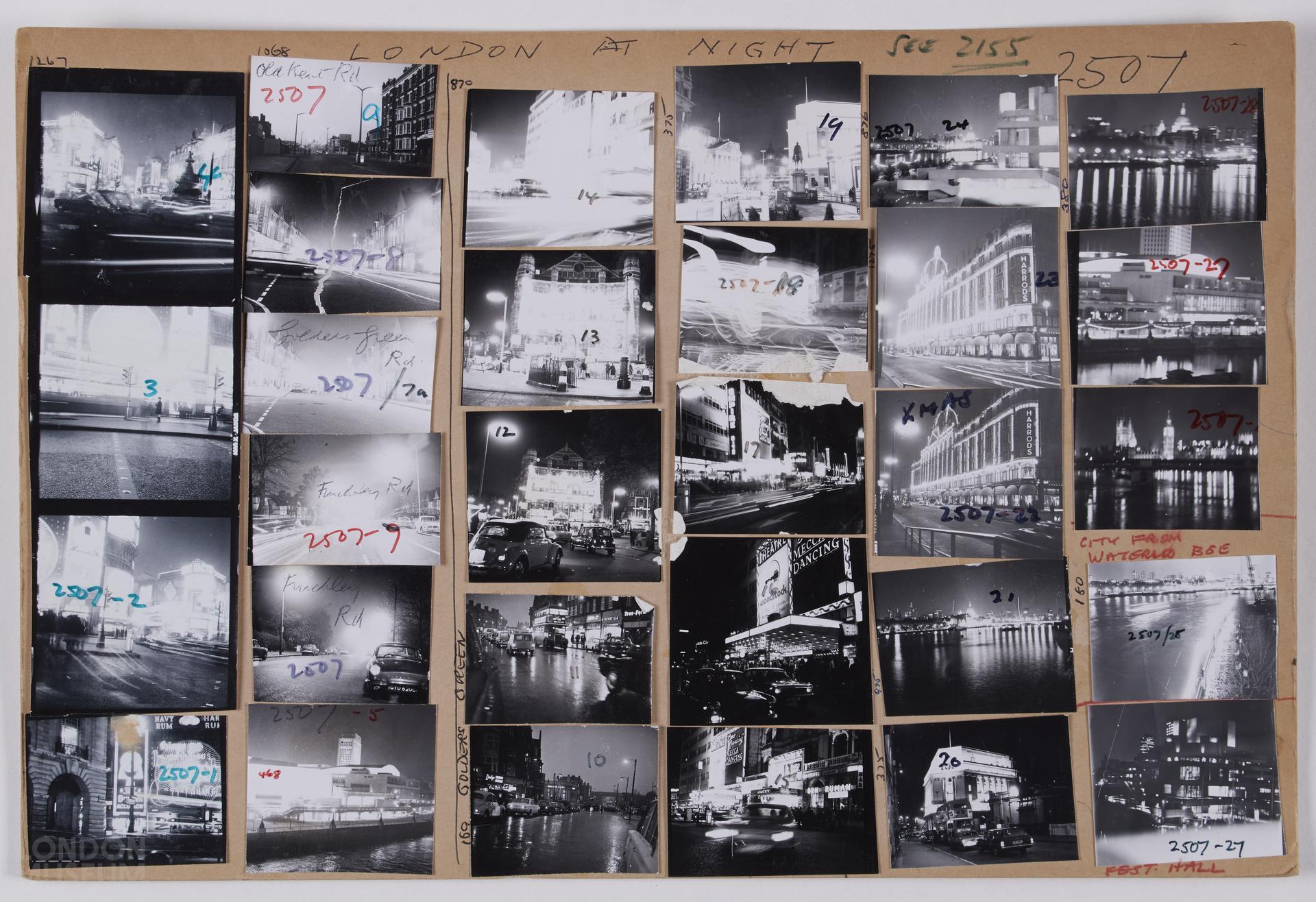 London at night, 1967, 1968. Images include Golders Green, City, Harrods. Contacts numbered 1-7, 7a, 8-25, 26?, 27 x 2, 28. 1 sheet.