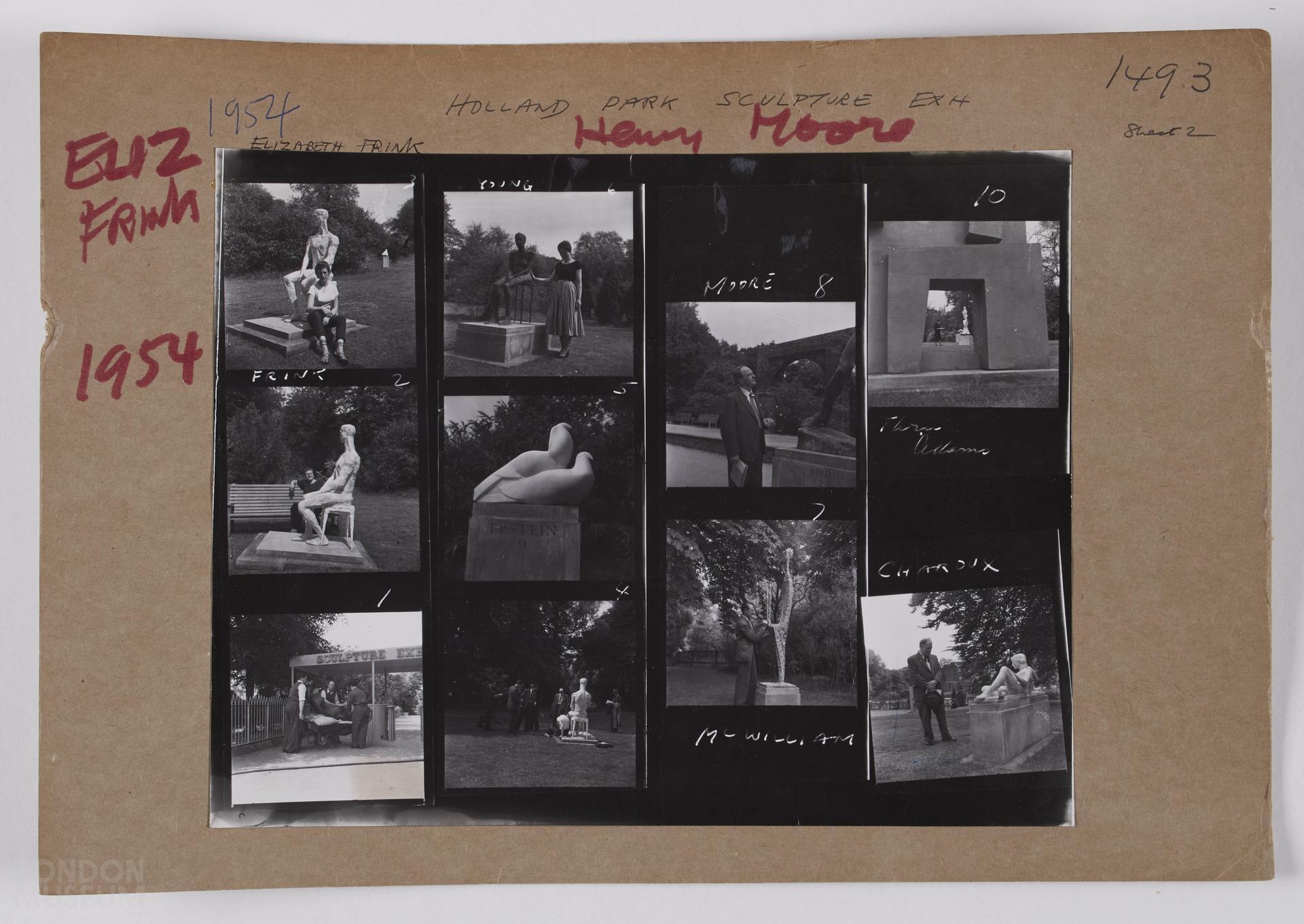 Holland Park Sculpture, 1954: Shots of sculpture in the park, and portraits including Henry Moore, Elisabeth Frink, Young, Mc William, Charoux. 6x6 cm (1-10), 35 mm (26 not numbered).